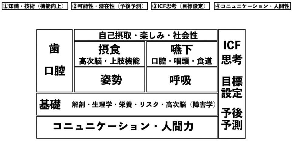 摂食・嚥下に対する知識や技術だけでなく、その利用者さんごとの目標設定や予後予測を行うスキルを養います。そして最も重要な点は”人間力”です。